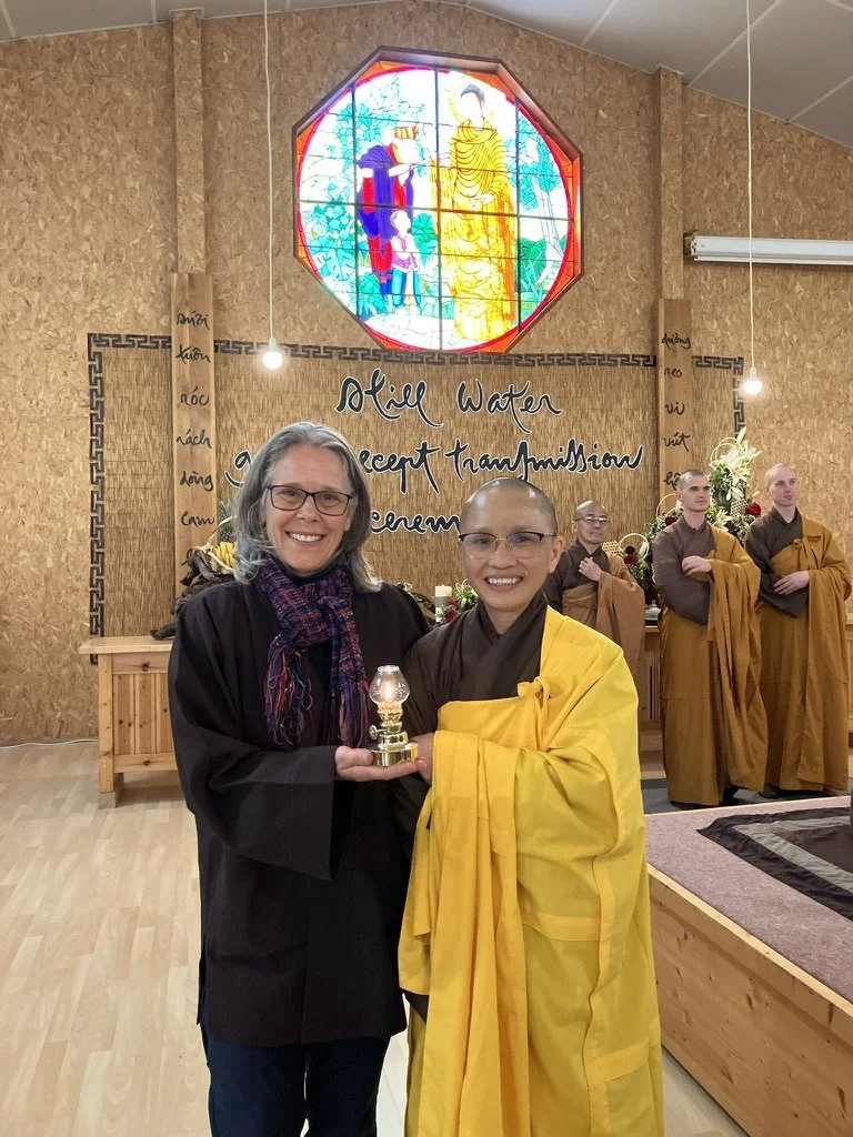 Since 2007 she has studied and practiced in the Plum Village monasteries in Europe and North America. In 2011, Thích Nhất Hạnh ordained Susan as a lay Buddhist minister in the Order of Interbeing, where she serves locally, nationally, and internationally as a community builder and peace maker. In the spring of 2025 she received the Lamp Transmission from Brother Chân Pháp Dung in Plum Village, France, authorizing her to teach as a Dharmacharya. Susan sits in the 43rd generation of the Lâm Tế Dhyana School and the 9th generation of the Liễu Quán Dharma line. She practices with the Multifold Sangha (nuns, monks, lay women and lay men) including at Blue Cliff Monastery, Magnolia Grove Monastery, Deer Park Monastery, and Plum Village. She has taught Dharma practices in universities and elementary schools, art museums, senior centers, hospitals, community centers, for the Veteran’s Administration, and at Days of Mindfulness and retreat centers. Susan is the resident Dharma teacher for Greensboro’s Deep River Sangha/Community of Mindful Living, supporting Sangha members study and practice.